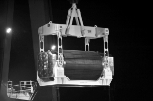 一个核废料集装箱被运上货船