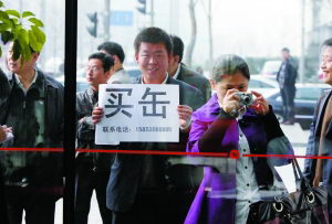 昨日,从山东来京的谭先生因未获得入场竞拍资格,在门外打出“买缶”的广告。图片来源:新京报 记者 王申 摄