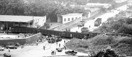 火车车厢破墙出轨,冲到公路上,造成交通中断。昨日6时许,荆门一货场内的货运列车5节车厢出轨,其中4节车厢“走”上公路。记者在现场看到,荆门市掇刀区军马场路路边的围墙被撞出一个大洞,几节车厢横卧在与货场一墙之隔的军马场路上,车厢底部的车轮和车轴严重变形。出轨列车共有10节车厢,事发后货场内并没有发现火车车头,出轨车厢里面装满了燃煤。