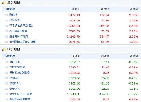 截至收盘,道琼斯工业平均指数上涨了172.54点,至8472.40点,涨幅为2.08%;纳斯达克综合指数上涨了37.20点,至1829.54点,涨幅为2.08%,标准普尔500指数上涨了19.32点,至920.26点,涨幅为2.14%。