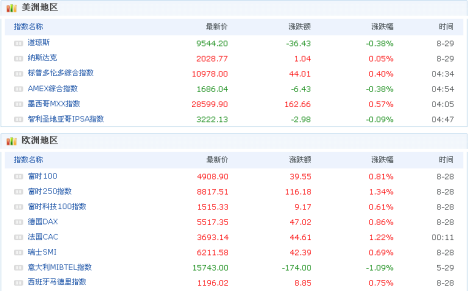 截至收盘,道琼斯工业平均指数下跌36.43点,跌幅为0.38%,至9544.20点;纳斯达克综合指数上涨1.04点,涨幅为0.05%,至2028.77点;标准普尔500指数下跌2.05点,跌幅为0.20%,至1028.93点。