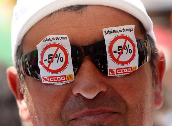 在巴塞罗那,一名男子在他的太阳镜上贴上了抗议政府将公共机构雇员工资下调5%的小标语。