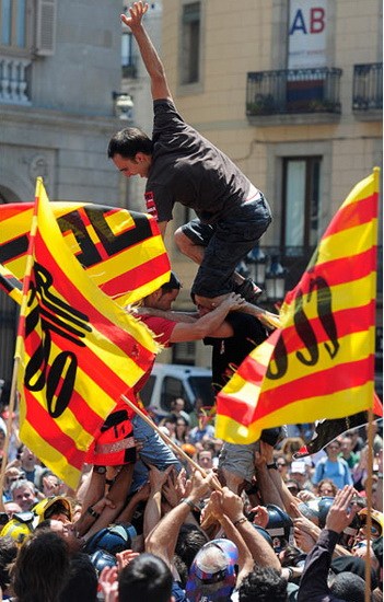 巴塞罗那的罢工,当地工人试图叠起一座人塔,抗议政府削减开支的紧缩政策。