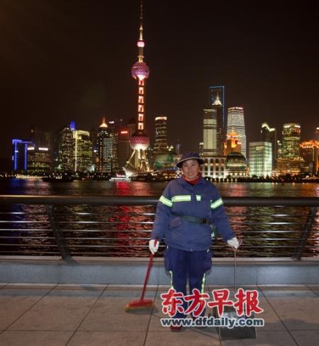 昨晚,曾凡琴在清扫外滩平台,身后是在试灯的东方明珠。39岁的曾凡琴来自贵州,这份工作已经做了一年。早报记者 徐晓林 实习生 陈荣辉 图