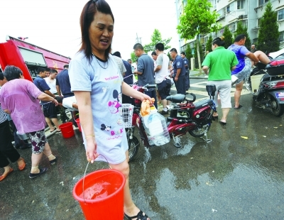 昨天早上6点多钟,银龙花园小区门口,很多前夜没洗澡的居民拎着水壶水桶聚集在门口,大约7点左右,消防车赶来了,居民们争先恐后蜂拥而上,一些因为无水洗澡甚至晚饭都没吃、闷热一夜的居民起初情绪有些激动,闻讯赶来的社区领导、辖区民警和小区物业人员耐心解释:“大家排好队一个个来接水,每隔10分钟一趟,送水的消防车会源源不断送水直到恢复供水的!”随后赶来的白下区政府相关负责人当众表态。果然,又一辆运载10吨自来水的消防车开来了,居民们纷纷按序排队打水。记者看到,居民打水接水的工具五花八门,有水壶水桶,有用扁担挑水的,有搬运放衣服的整理箱接水的,也有一家老小齐上阵,大盆小桶都来接水的。据了解,此次停水范围包括银龙花园1到5期、鸿意星城和万达紫金明珠等小区1.5万户居民。从前夜11点起,南京市和白下区政府有关部门调集了6辆消防车和3辆自来水公司的送水车前往上述停水小区的5个点不间断供水。
