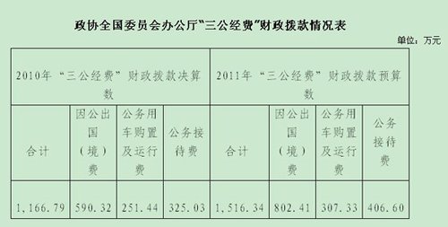 政协全国委员会办公厅2011年“三公经费”财政拨款预算1,516.34万元,包括:出国(境)费802.41万元、车辆购置及运行费307.33万元、公务接待费406.60万元。分享到: 相关专题: 订阅推荐微博: 王跃春 人物周刊陈磊 龚晓跃 天襟地衣 陈春彦全部收听