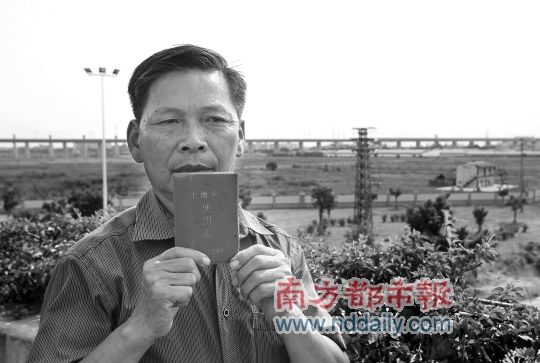 郭叔在被征收的土地旁展示自己的土地承包使用证。南都记者 冯宙锋 实习生 林宏贤 摄