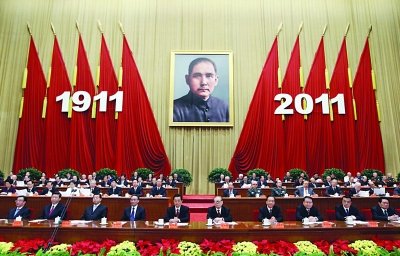 人民大会堂大礼堂花团锦簇,灯火辉煌,气氛庄重而热烈。主席台上方悬挂着“纪念辛亥革命100周年大会”会标,帷幕正中是孙中山先生的巨幅画像,10面鲜艳的红旗分列两侧,上面悬挂的“1911”“2011”字标格外醒目。