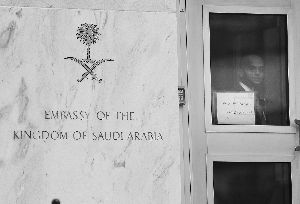 10月11日,在位于美国华盛顿的沙特阿拉伯大使馆,一位使馆工作人员通过一扇玻璃门向外看 新华社/法新