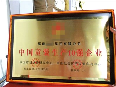 张女士出示的收费协议书上显示,甲方为中经咨询,乙方为企业,甲方在市场调查和考证相关资料的基础上,推选乙方作为“中国××行业十大畅销品牌、十大著名品牌”暨“中国××行业10强企业、中国××行业50强企业”候选单位,在乙方符合评价标准的基础上向社会发布,并由甲方颁发证书和奖牌。企业可自行选择参评项目,“一般来说十大著名品牌、十大畅销品牌是24800元,行业10强贵一些,36000元。如果都评,就是6万多。只要交钱,没有评不上的,一般一周内就能把牌匾和奖牌制作好。”