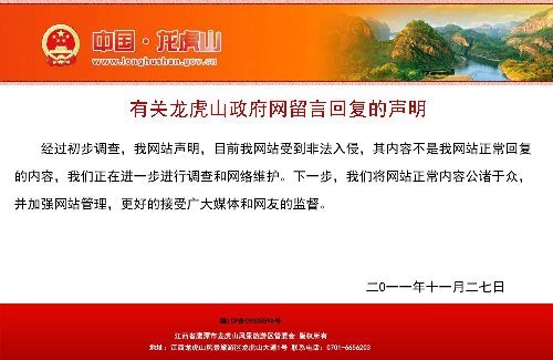 27日,江西龙虎山政府网发出一则“声明”,称网站受到非法入侵,其内容(留言回复,编者注)不是该网站正常回复内容,正在进一步进行调查和网络维护。记者发现,该政府网站目前已无法看到具体栏目内容。