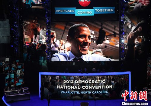 美国民主党全国代表大会当地时间4日在北卡罗来纳夏洛特开幕。总统奥巴马通过一段宣传片在开幕式上“亮相”。中新社发 摄