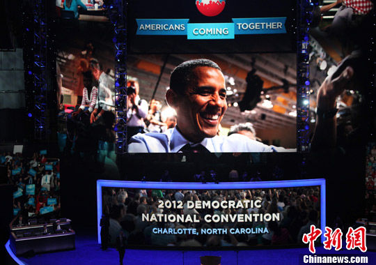 美国民主党全国代表大会当地时间4日在北卡罗来纳夏洛特开幕。总统奥巴马通过一段宣传片在开幕式上“亮相”。中新社发 李洋 摄
