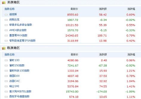 截至收盘,道琼斯工业平均指数上涨了58.42点,报收8555.60点,涨幅为0.69%;纳斯达克综合指数下跌了0.34点,报收1807.72点,跌幅为0.02%,标准普尔500指数上涨了7.66点,报收918.37点,涨幅为0.84%。
